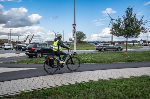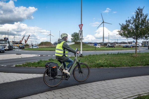 - Rij het fietspad pas op als ziet dat er geen vrachtwagens meer op de rotonde rijden.