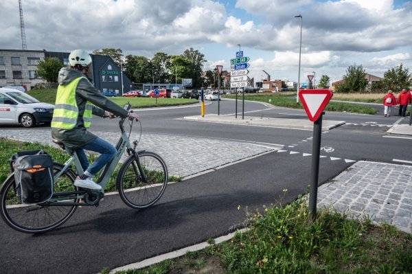 Bestuurders die de rotonde willen verlaten én oprijden, moeten jou voorrang verlenen zolang je op het doorlopende fietspad rijdt.